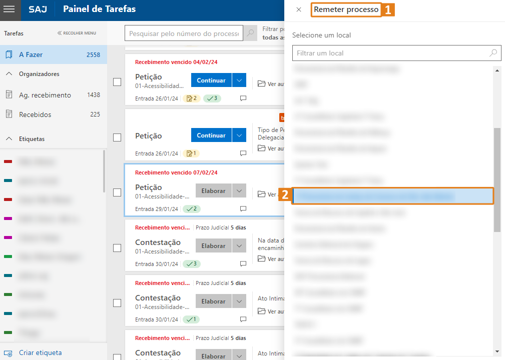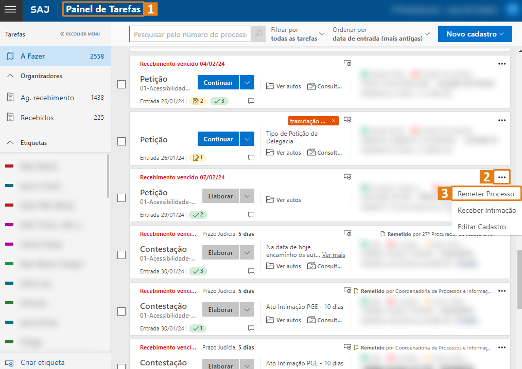 Passo 1. Na tela do Painel de Tarefas (1), selecione um processo, clique no ícone representado por reticências - três pontos (2) e, em seguida, clique no botão “Remeter Processo” (3).