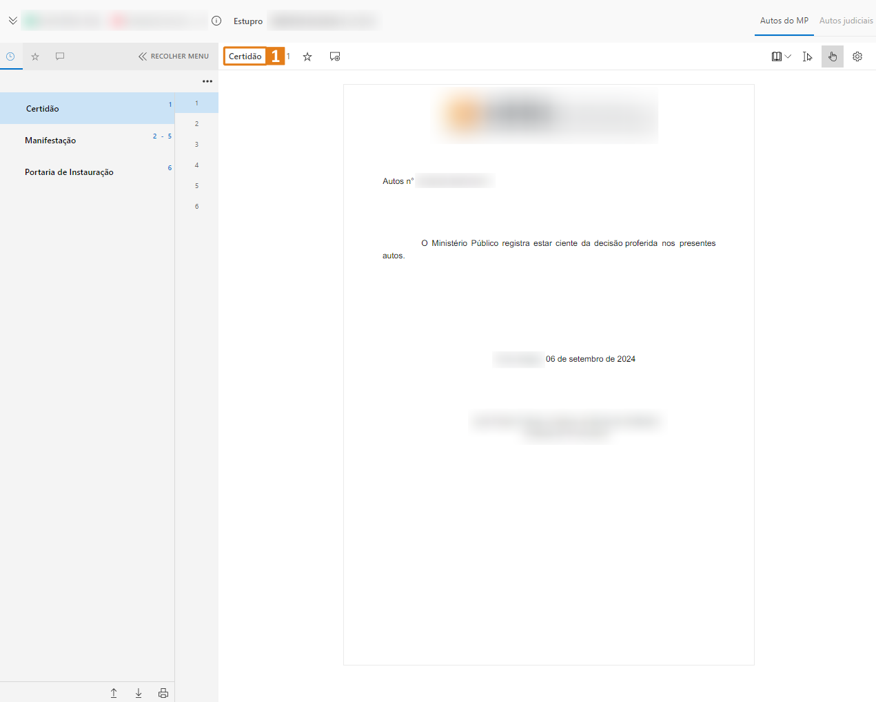 Passo 2. Feito isso, a intimação será recebida, a certidão (1) será gerada automaticamente e disponibilizada nos autos do MP e, finalmente, peticionada.