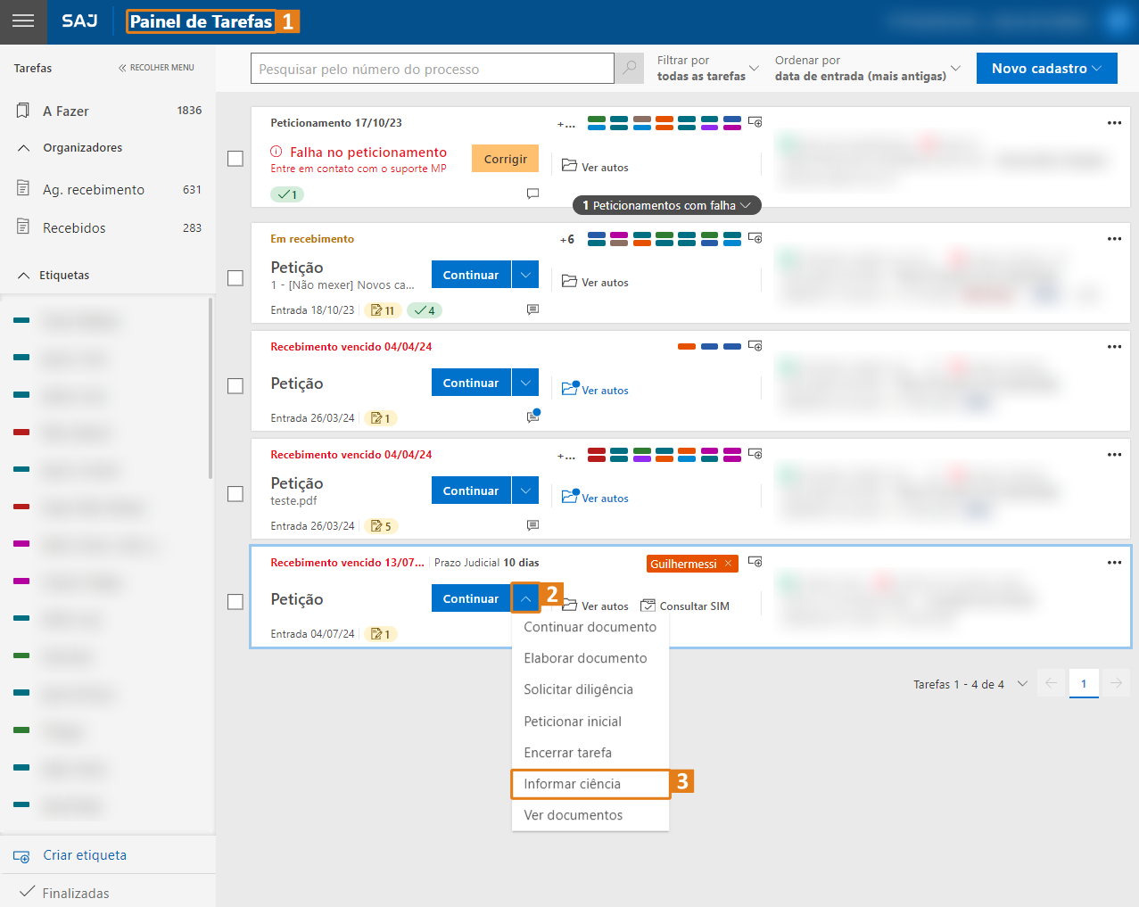 Passo 1. No Painel de Tarefas (1), escolha uma tarefa, clique no ícone representado por uma seta (2) e, em seguida, clique no botão “Informar ciência” (3).