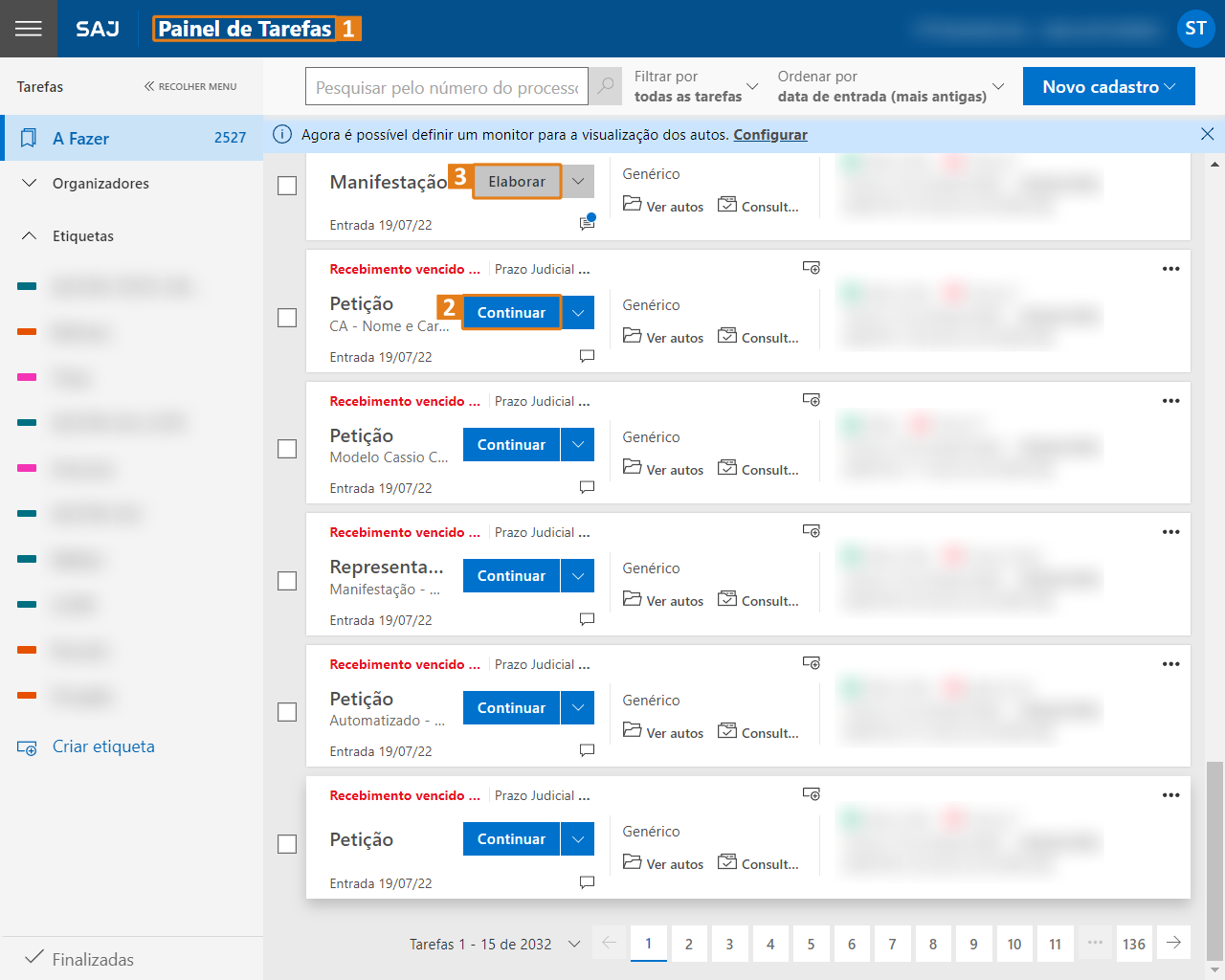 Passo 1. No Painel de Tarefas, selecione a tarefa na qual você irá elaborar uma manifestação e clique em “Elaborar” (1).