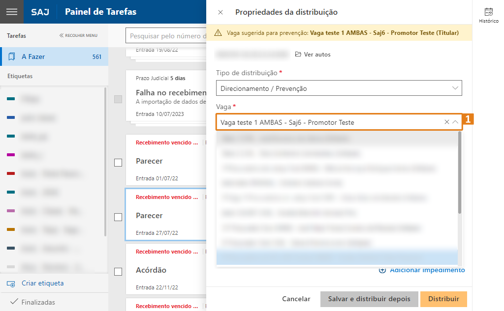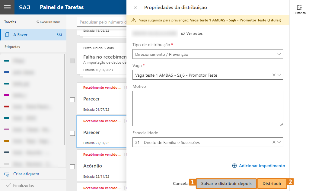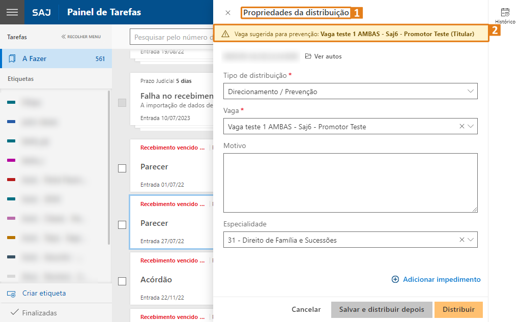 ObservaçãoNesta versão, as novas tarefas de processos com prevenção serão encaminhadas automaticamente para o agrupamento "Aguardando para distribuir por prevenção", facilitando a identificação e o gerenciamento desses processos no painel.Passo 2. A janela suspensa Propriedades da Distribuição (1) será exibida. Ao carregar as informações da tarefa, o sistema realiza a consulta para identificar se o processo em análise possui ou não prevenção, considerando distribuições realizadas anteriormente pela Secretaria no SAJ Online. Caso haja prevenção, o sistema apresentará um aviso (2) que indicará a existência de uma vaga sugerida para prevenção.