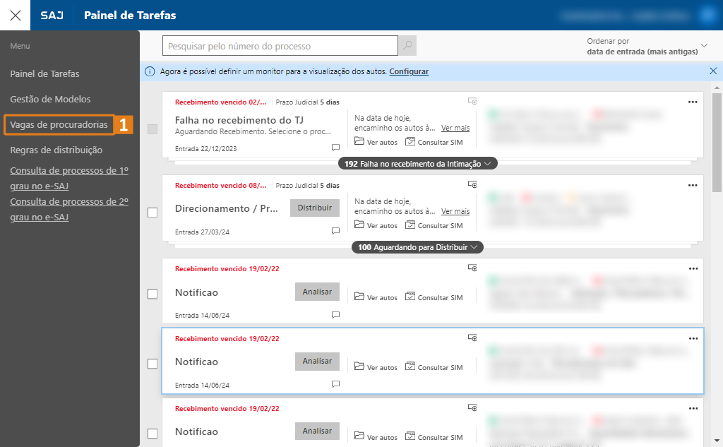 ObservaçãoNeste exemplo, a visualização está ordenada pela coluna "Total do mês" em ordem decrescente.Passo 4. O totalizador de distribuições também pode ser visualizado na lista de Procuradorias. Para acessá-lo, clique no botão “Vagas de procuradorias” (1) localizado no menu principal do Painel de Tarefas.