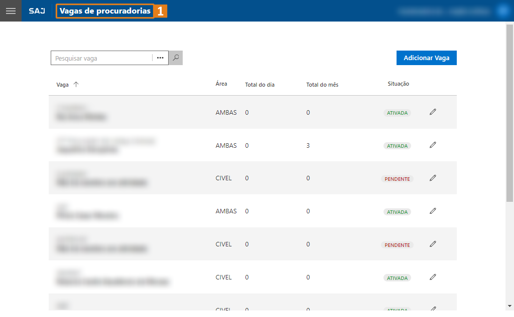 Passo 5. A tela Vagas de procuradorias (1) será exibida, apresentando a listagem completa de todas as vagas, bem como o quantitativo diário e mensal de distribuições.