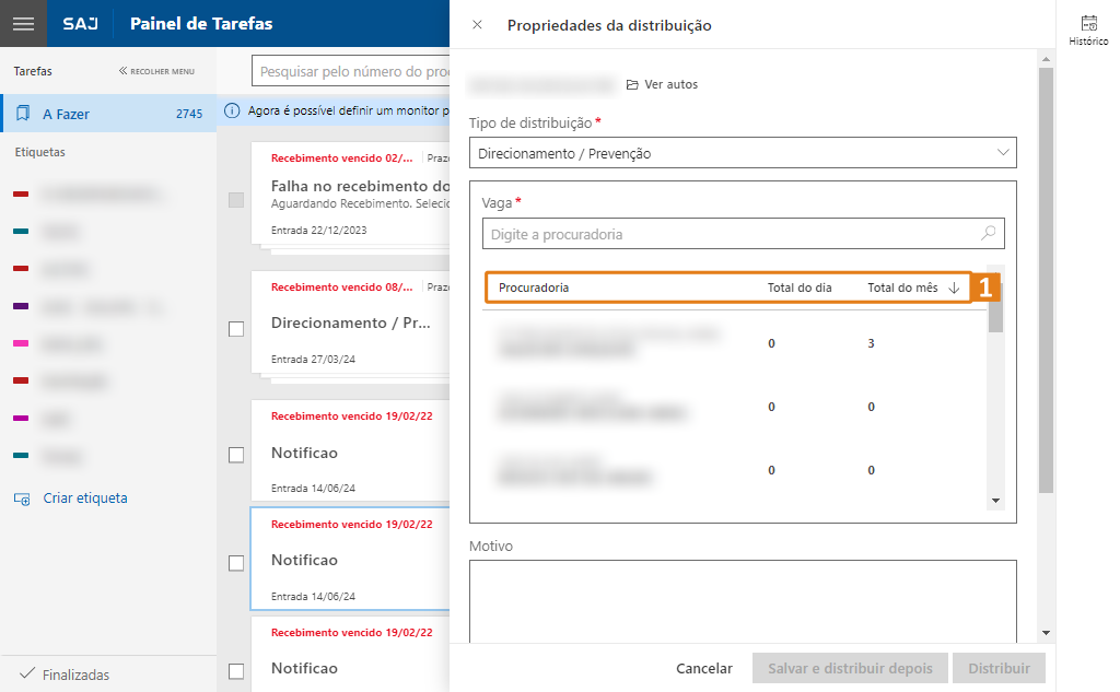 Passo 2. A janela suspensa de Propriedades da distribuição (1) será exibida. Ao carregar as informações, o sistema mostrará a lista de vagas na seção Vaga (2), permitindo visualizar a quantidade de distribuições realizadas no dia e no mês para cada Procuradoria.