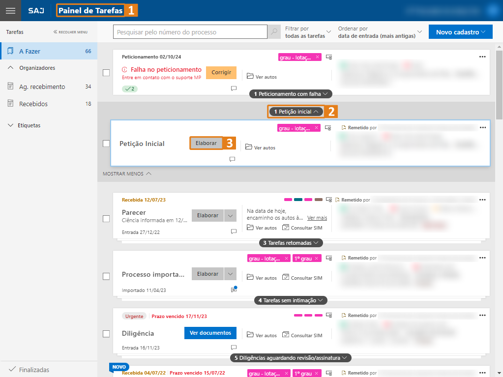 Passo 1. Após realizar um Cadastro de Processo de 2º Grau, no Painel de Tarefas (1), localize a tarefa desejada no agrupamento Petição inicial (2) e clique no botão “Elaborar” (3) para iniciar a criação do documento que será utilizado para peticionar.