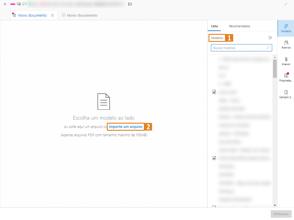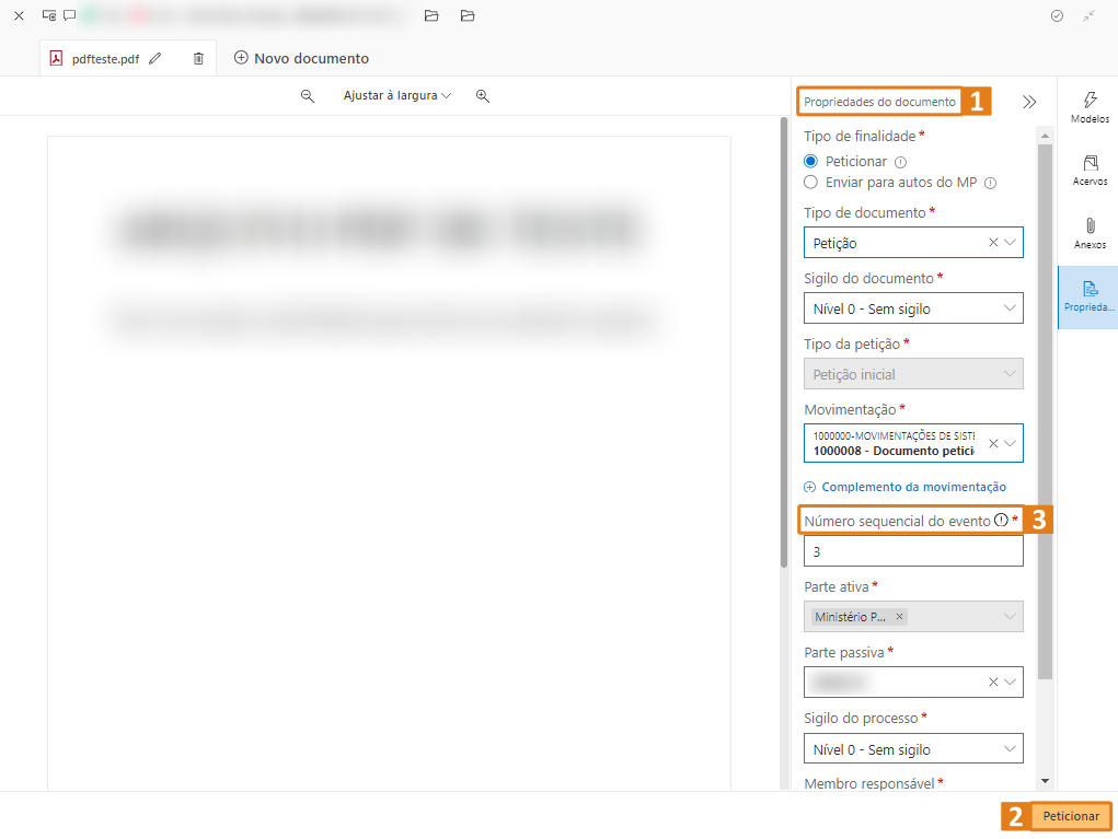Passo 3. Após elaborar ou importar o arquivo, preencha as Propriedades do documento (1), informando os dados necessários para o peticionamento. Ao final, clique no botão “Peticionar” (2) para prosseguir corretamente com o envio.