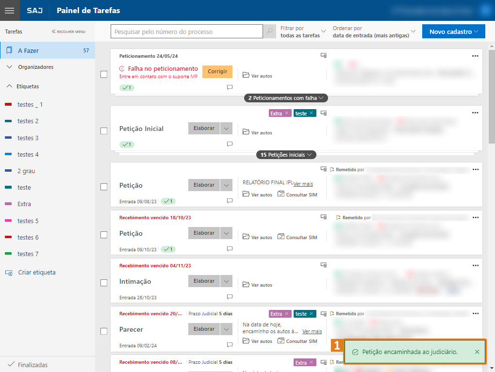Passo 1. No Painel de Tarefas, selecione a tarefa do processo que deseja enviar intimados e clique na opção “Elaborar” (1).